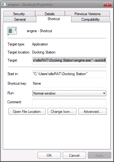 Only it'll link to your file instead of mine ^^ Note the space between " and the --autokill , it needs to be there. Hit apply and okay and every time you launch the game via that shortcut, autokill will be enabled. If you want to change it back, just remove the space and the --autokill, hit apply and ok and it'll be back to normal.