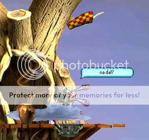 Minty (mlohse) still hasn't quite made the drop off the lookout tower. He's currently fascinated with the red-and-yellow checkered... weather vane? I'm not sure what exactly that thing is called, but whatever it is, it's certainly caught Minty's attention. I love how the cloud is hovering over him like some sort of well-timed censor bar. Mintyyy, what are you doing up there?