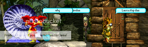 Below the opposite side of the desert, Pyrrhon (Grendel_Man) is inquiring as to Laura's demand to stop that awful "daa." Weren't you paying attention, Pyrrhon? The girl you've previously made out with has been wallbonking for the past four minutes -- and that's got to hurt! Seriously, man. Pull yourself together... and pull her away from that wall.
